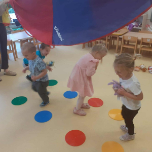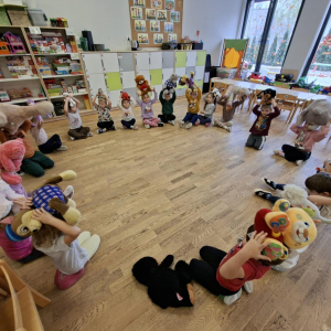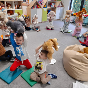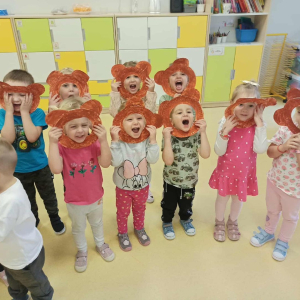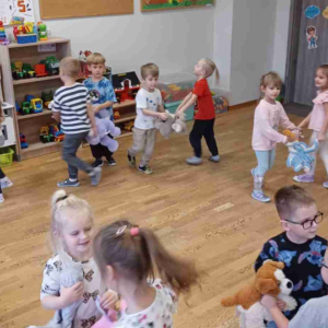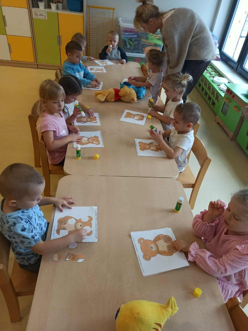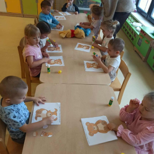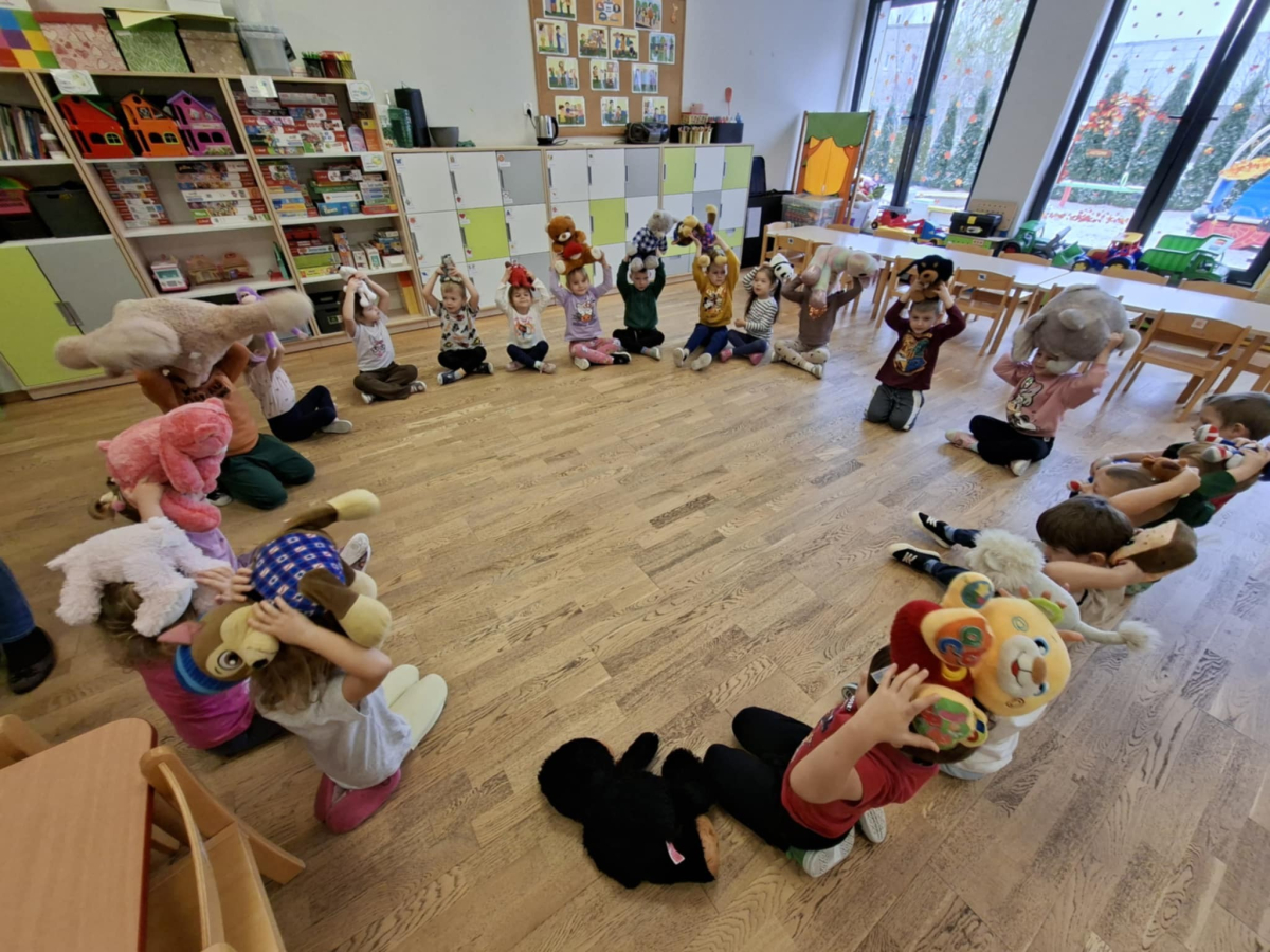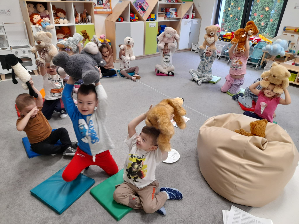 Wykonaliśmy misiowe prace plastyczne, podczas których dzieci rozwijały swoją wyobraźnię i zdolności manualne. Nie zabrakło również zabaw ruchowych przy muzyce oraz „misiowej gimnastyki”.
