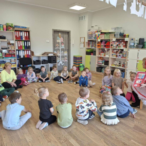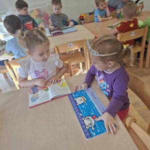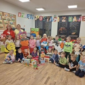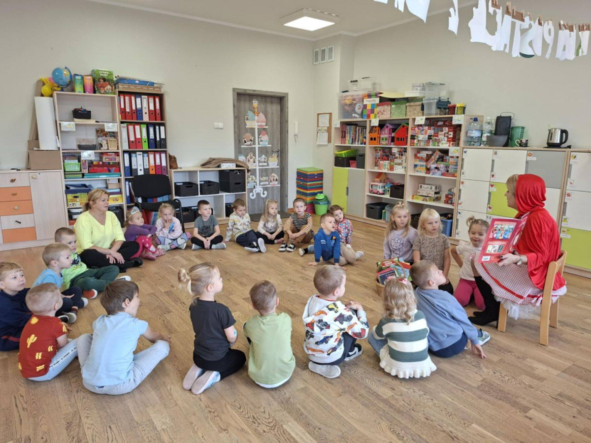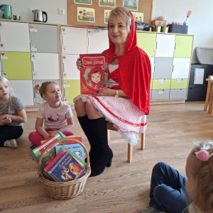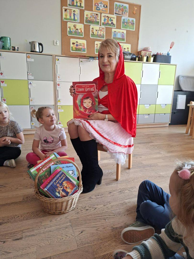 Tego dnia grupę Żyrafek odwiedził Czerwony Kapturek, który osobiście opowiedział dzieciom swoją niezwykłą historię. Przedszkolaki wzięły również udział w tematycznych warsztatach, rozwijając wyobraźnię i kreatywność. Nie zabrakło także prezentacji najciekawszych książek dla najmłodszych, które zachęcały dzieci do sięgania po literaturę i wizyty w bibliotece.