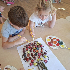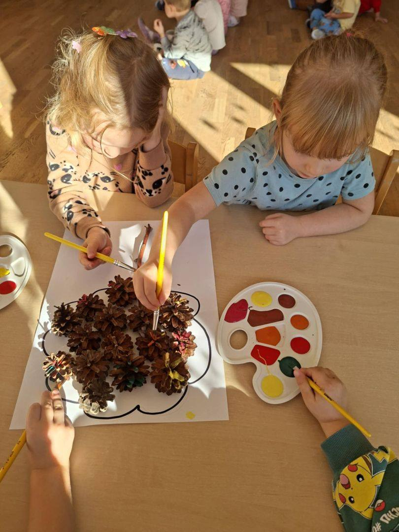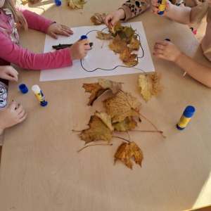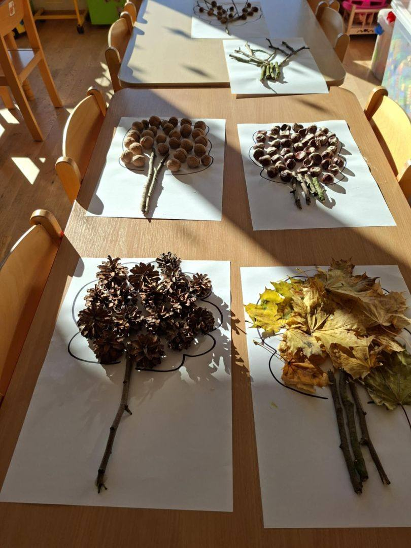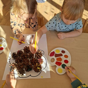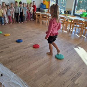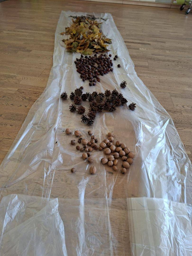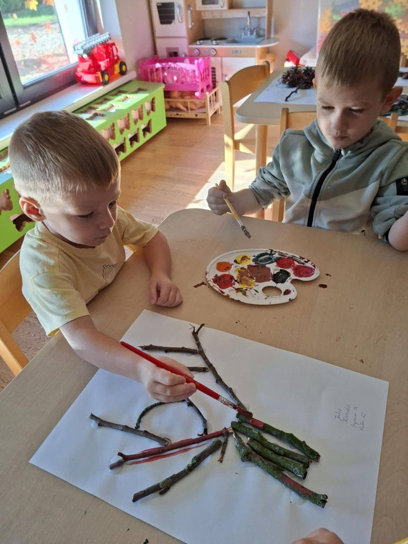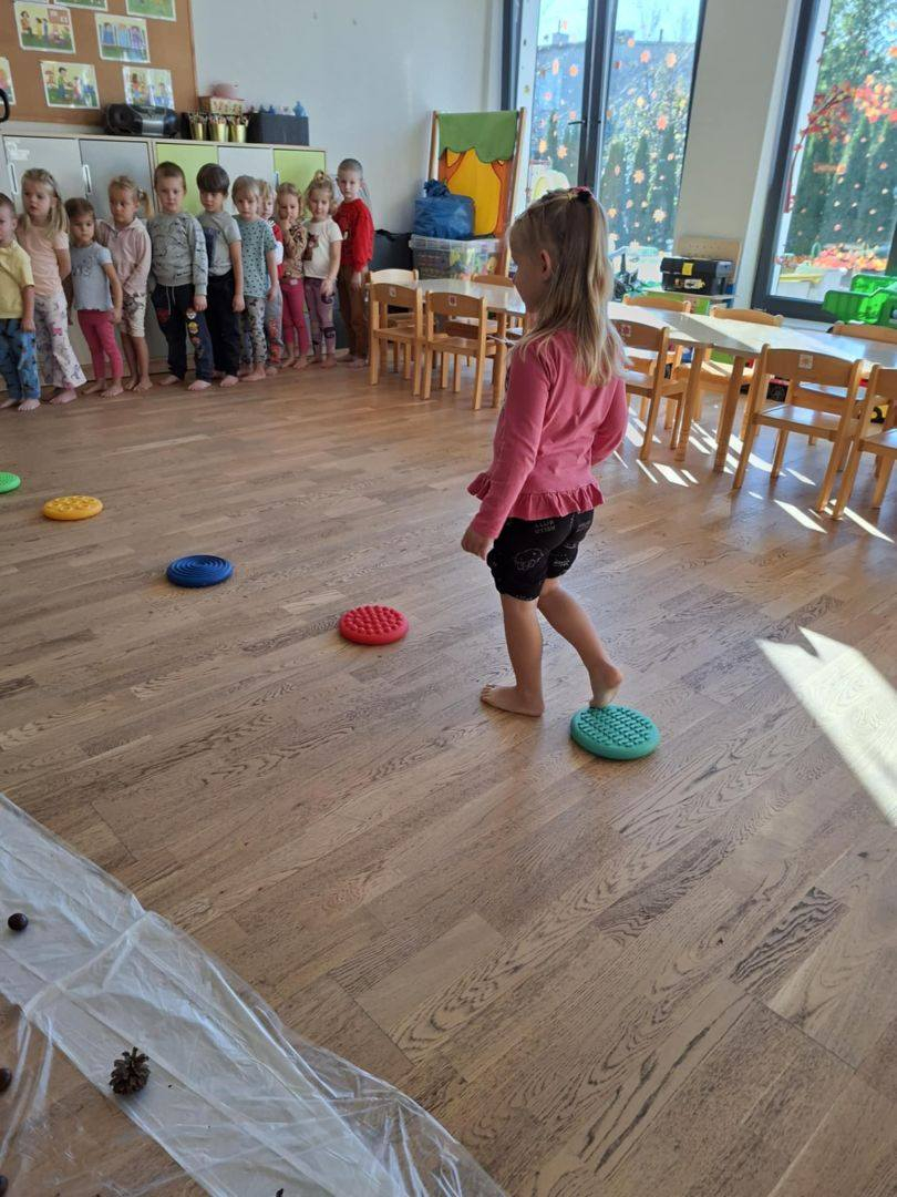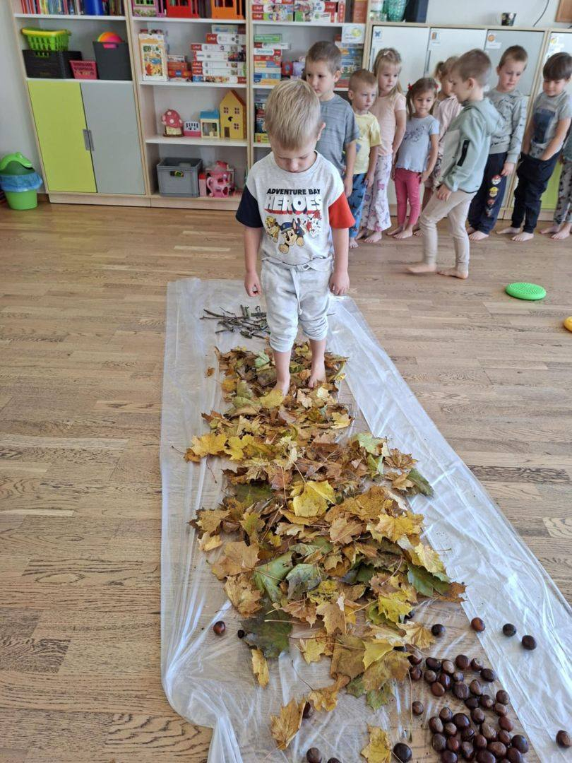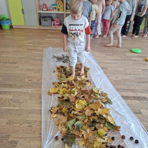 Natomiast dzieci z grupy Żyrafkek postanowiły odkrywać jesienne skarby w trochę inny sposób. Wędrowały po ścieżce sensorycznej stworzonej z darów jesieni – liści, szyszek, kasztanów, żołędzi i patyków.
