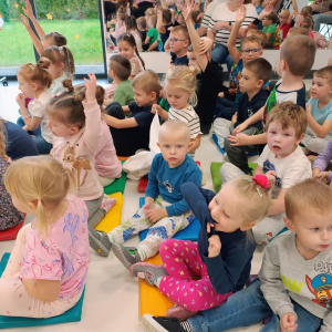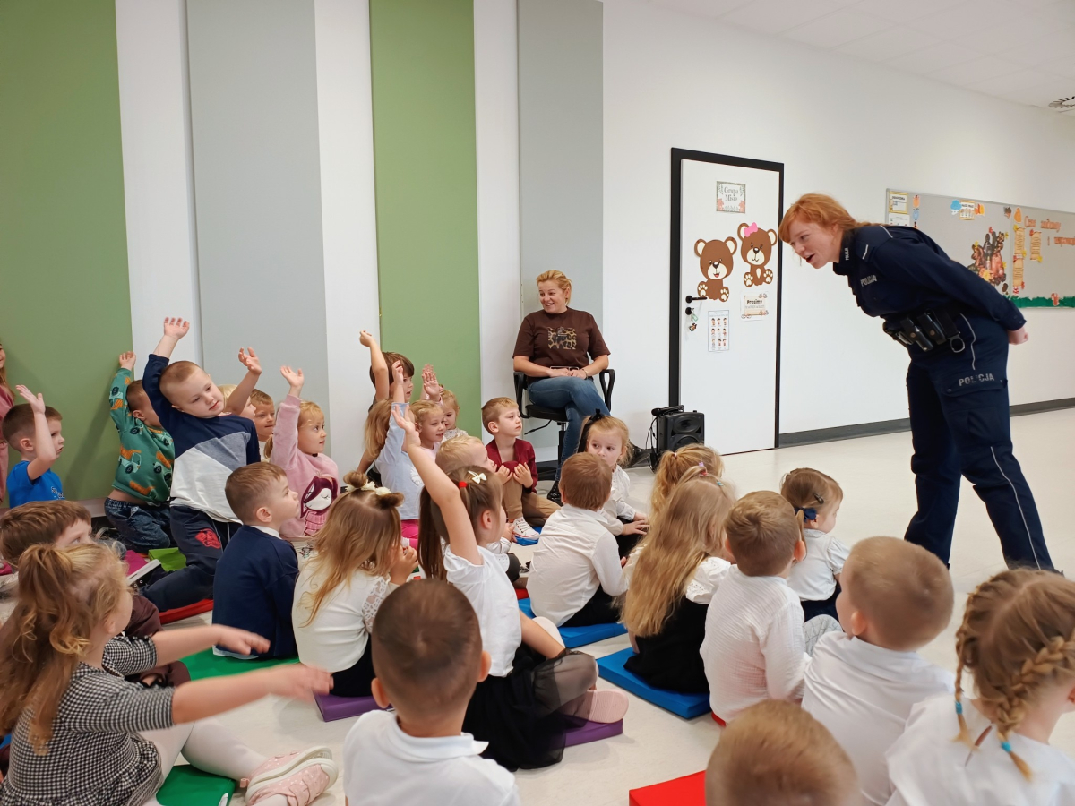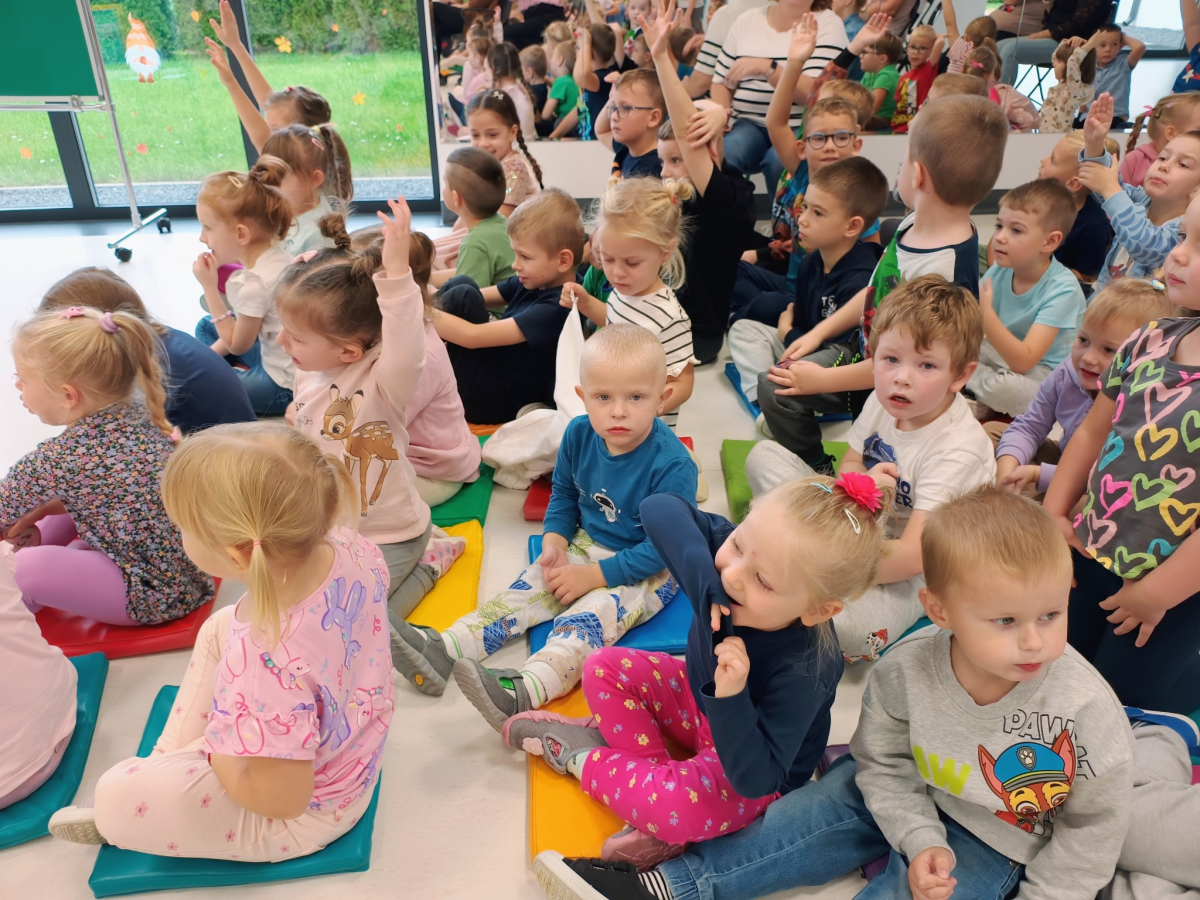 Przedszkolaki z ogromnym zaangażowaniem uczestniczyły w rozmowie, odpowiadały na pytania i dzieliły się własnymi doświadczeniami.